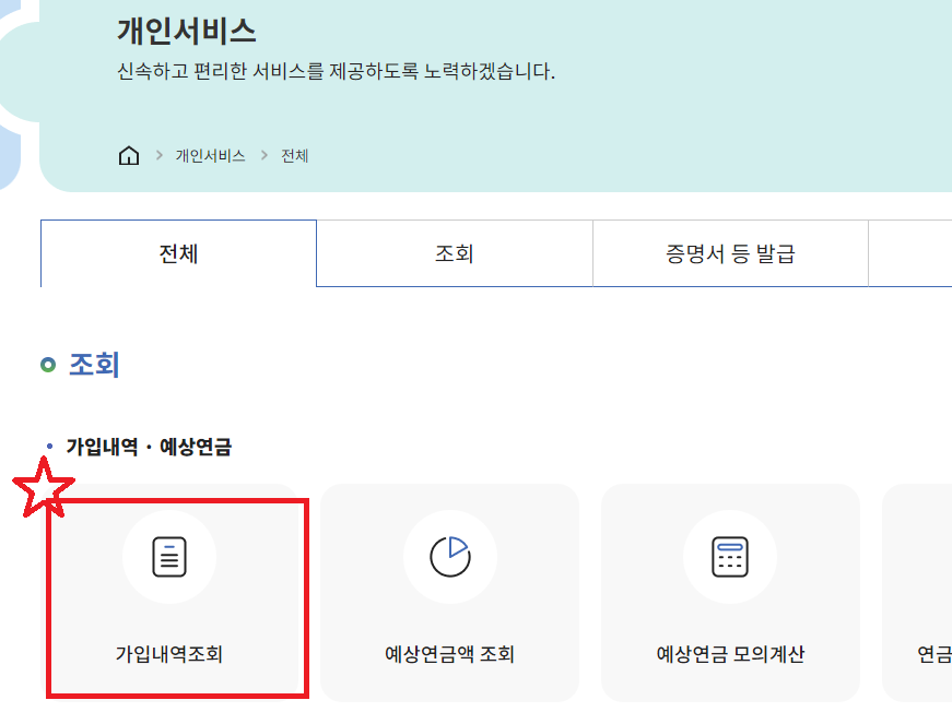 ▶공단 홈페이지 접속 후 메인 화면에서 '가입내역조회' 메뉴 버튼을 클릭합니다.